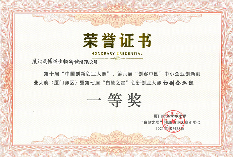 第十届“中国创新创业大赛”、第六届“创客中国”中小企业创新创业大赛(厦门赛区)暨第七届“白鹭之星”创新创业大赛已于10月28日顺利结束。经过初赛、复赛、决赛角逐, 厦门英博迈生物科技有限公司在400余家参赛企业中脱颖而出,荣获初创组企业一等奖。